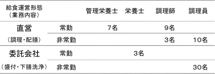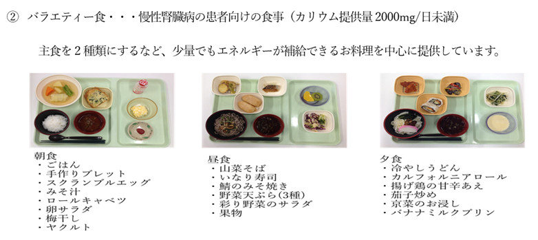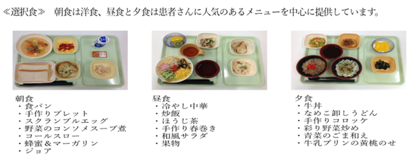 給食運営は直営(盛りつけ、下膳、洗浄業務等は委託)であり、ニュークックチル方式を導入しています。約束食事箋(成分栄養)に基づいて治療食を提供しており、選択食は、常食の患者を対象に1日3食(月曜日~土曜日)実施しています(年末年始を除く)。 入院患者の栄養ケアでは、管理栄養士1人が1~2病棟を担当し、病棟の医師・看護師・薬剤師等と連携し低栄養患者の栄養管理を行っています。多職種チームの一員として、慢性腎臓病透析予防指導、腎臓リハビリテーション教育入院、栄養サポートチーム活動、特定保健指導等に積極的に取り組んでいます。個別栄養食事指導は、平日(9時~16時)予約制で行っています。