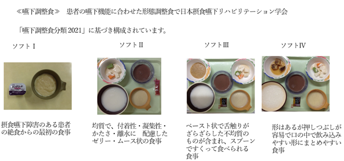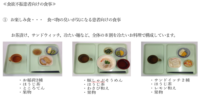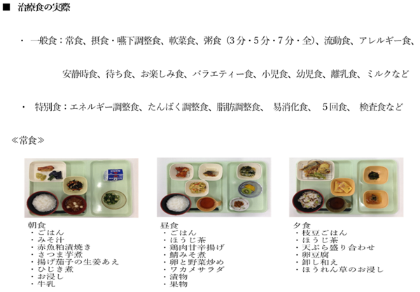 治療食を栄養ケアの基礎(土台)と位置づけ、安全(衛生管理の徹底、誤配膳の防止)で良質(最新の食事 療養基準の導入、献立や調理の工夫でおいしさ追求)な治療食の提供に努めています。