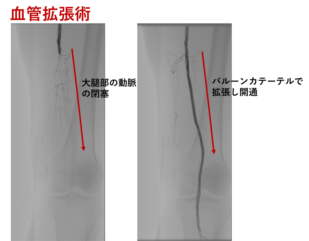 カテーテルという細い管を使って動脈の中から治療する方法です。風船やステントで血管を広げて血流を改善する方法です。皮膚を大きく切開する必要がなく、身体への負担が少ないことが特徴です。