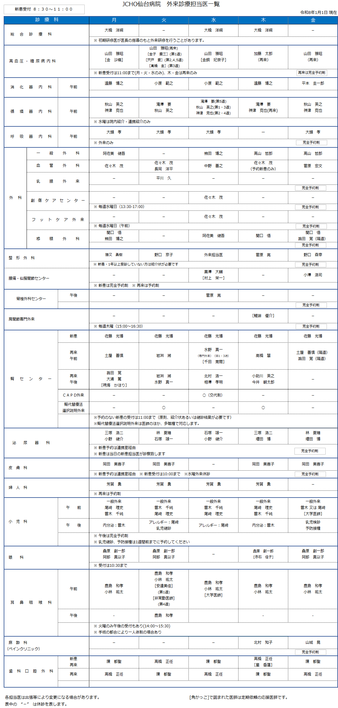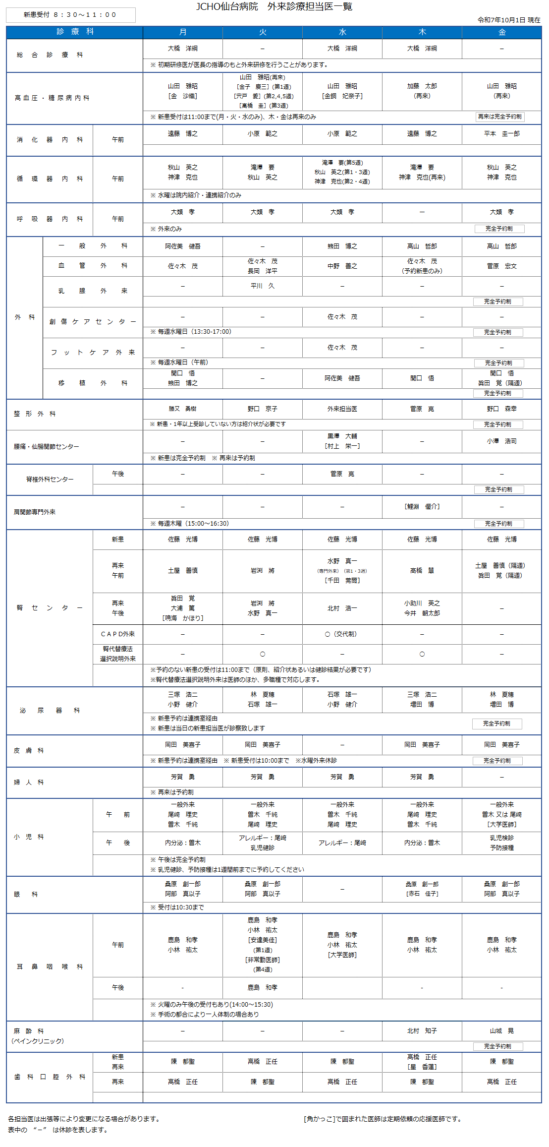 詳しい情報は各科の担当医師表及び診療時間表をご確認下さい。